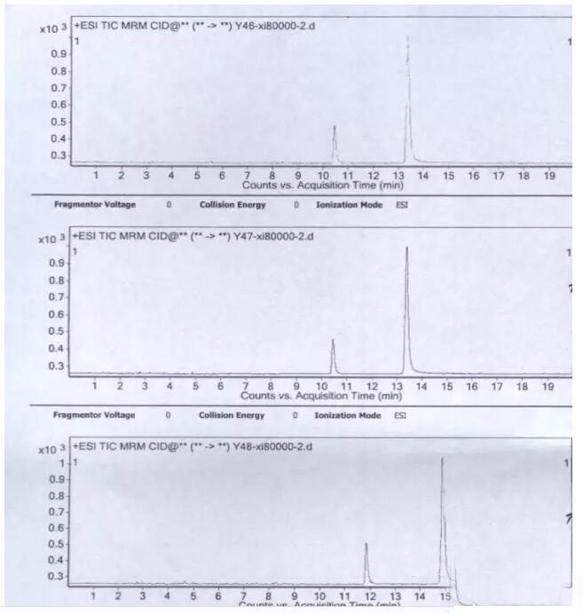 从图中可见1号未检出盐酸芬氟拉明;2、3号样品的质谱图略。