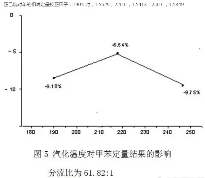 ②进样温度的变化对分析结果也有影响。分流比在1/30-1/80范围内,如61.80:1时,随着进样口温度的升高(190-250℃),低沸点组分正己烷正误差减小,较高沸点组分甲苯的负误差减小后增加。所以,本实验选择的汽化温度为220℃。