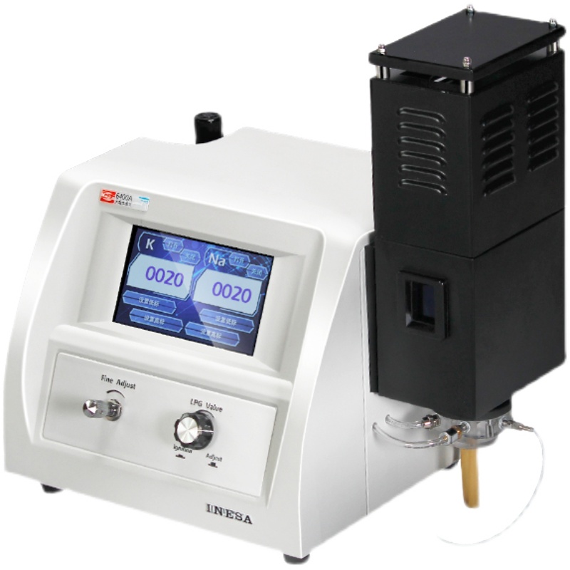 火焰光度计主要包括激发光源、单色器和光度计三部分。激发光源包括气体供应、喷雾器、喷灯等部分, 使被测溶液分散在压缩空气和氧气中成为细雾, 然后再与可燃气体混合, 在喷灯上燃烧。FP640 火焰光度计采用汽油作燃料, 一般选120 号汽油; 采用数字显示电路, 测量结果直接显示其样品浓度, 显而易见, 读数可靠。火焰光度计是相对比较测定的仪器, 在测量过程中, 经标定后, 可进行样品检测, 但随着几个或十几个样品的测定, 需要重新进行标准液的标定, 这样才能保证测试的准确度。